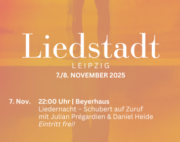 Konzerte & Liederabende Liedstadt Leipzig: Liedernacht – Schubert auf Zuruf 22:00 Uhr7. November 2025Beyerhaus Leipzig | Ernst-Schneller-Straße 6, 04107 Leipzig Mehr Info